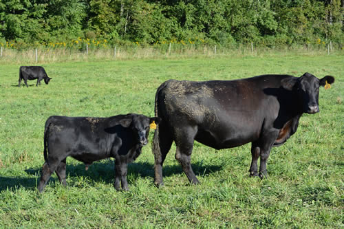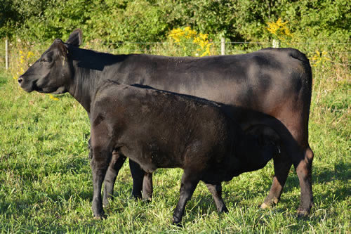 Lot 27, GRF Lucy 682, a GAR Predestined daughter of Lot 26 and a full sister to Lot 29 pictured summer 2013 with her May 2013 bull calf by SAV Angus Valley 1867, Lot 27a.